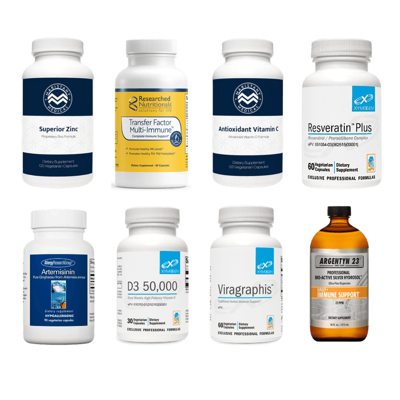 Powerful vitamins and minerals like Vitamin C, Zinc, Transfer Factor Multi Vitamin and Vitamin D that boost your immune system and reduce illness duration. Secret weapons like Viragraphis, Reservatin, Artemisinin, and Colloidal silver for kicking viral butt.