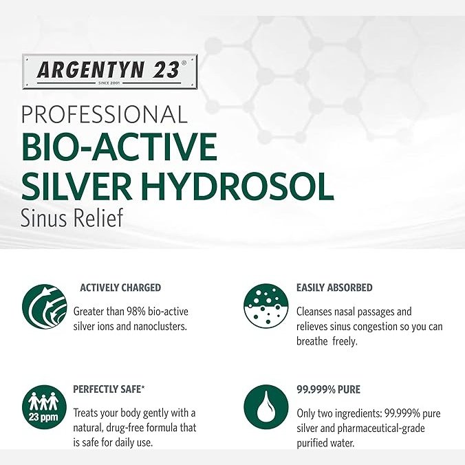 Breathe Freely with Argentyn 23 23ppm Professional Bio-Active Silver Hydrosol. All natural nasal spray, is drug-free, alcohol-free, non-drowsy, non-addictive and contains no artificial dyes. Scientifically-formulated with natural ingredients to provide quick nasal relief. Eases air flow and allows for clearer breathing by cleansing the nasal passages of pollutants and irritants. Only two ingredients: 99.999% pure silver and pharmaceutical-grade purified water. 1 & 2 oz. travel friendly sizes available for quick on-the-go Sinus Relief.