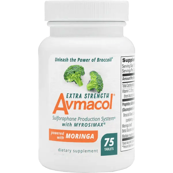 Avmacol® Extra Strength contains the essential ingredients necessary for sulforaphane production in the body, broccoli seed extract (Glucoraphanin) and Myrosimax® (Active Myrosinase Enzyme). Avmacol® Extra Strength also contains Maitake mushroom extract for added immune and detoxification support.
