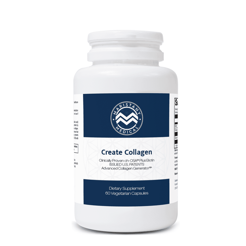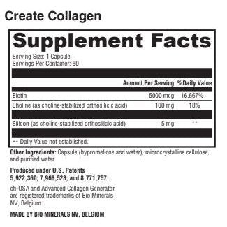 Create Collagen features clinically tested ch-OSA® (choline-stabilized orthosilicic acid) complemented with biotin. ch-OSA naturally helps nourish your body’s beauty proteins by supporting and activating enzymes used by collagen-generating cells to make collagen. Regular orthosilicic acid (OSA) has to be stabilized to avoid polymerization, a process that decreases bioavailability. ch-OSA’s patented choline-stabilization technology prevents polymers from forming and ensures OSA’s optimal absorption. By combining ch-OSA