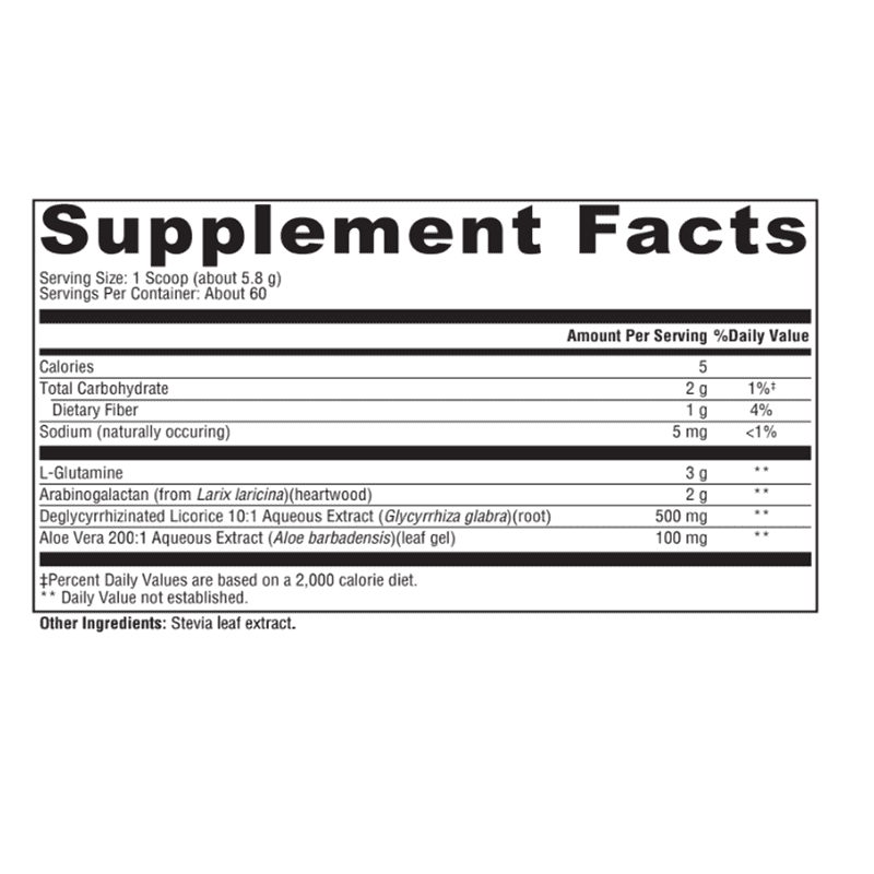 Gut Heal features four specialized ingredients for enhanced gastrointestinal support. This unique formula contains a concentrated extract of licorice that has been processed to remove glycyrrhizin—thus reducing risk of side effects associated with licorice. Glutamine serves as the predominant fuel and nitrogen source for the mucosal lining of the gastrointestinal (GI) tract. Arabinogalactan from the North American larch tree is a naturally occurring polysaccharide that provides excellent support for GI health.