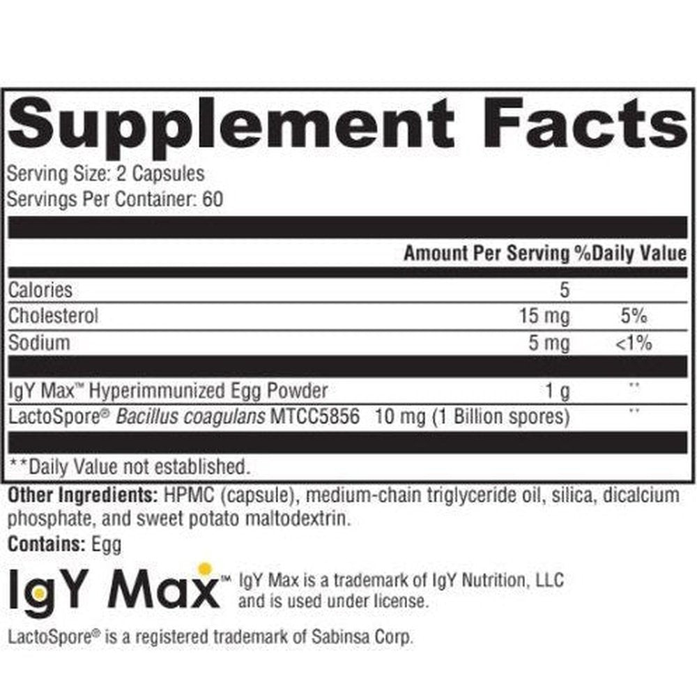 bacterial balance in the gut, this strain has been studied for its effects on maintaining blood lipid levels already within a healthy range and its effect on vaginal health. IG Spore Probiotic (IgY MaxTM), hyperimmunized egg powder, provides immunoglobulins and immune cofactors to support the body’s natural defenses by limiting non-beneficial