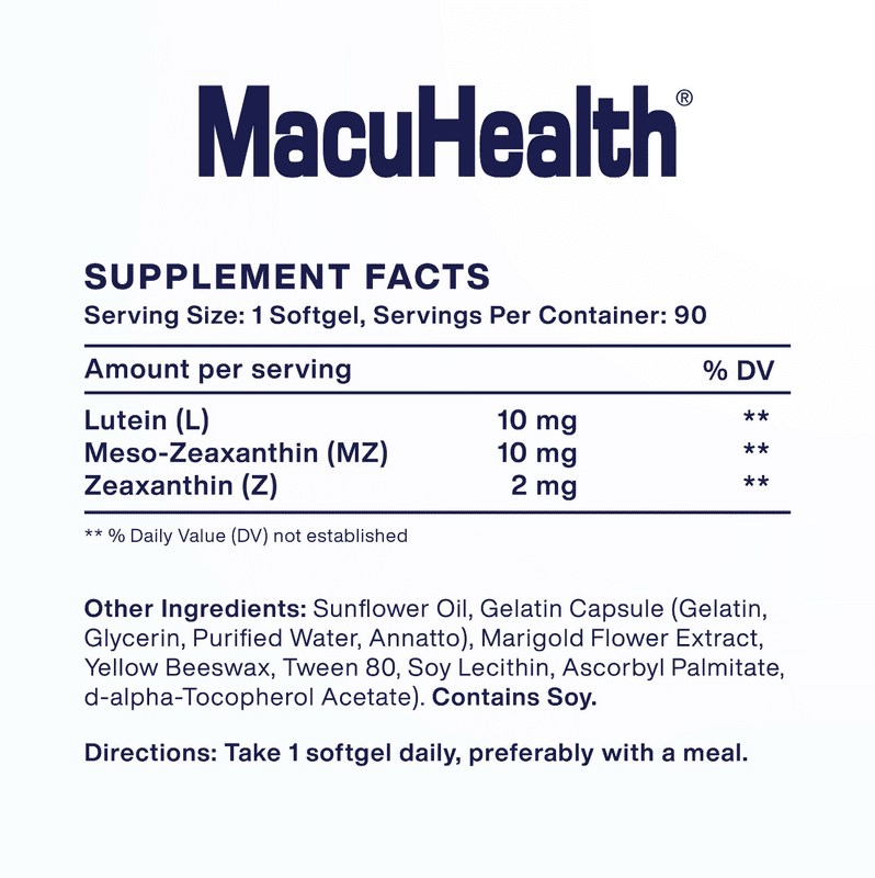 The 10:10:2 ratio of Meso-Zeaxanthin, Lutein, and Zeaxanthin has been demonstrated to increase macular pigment density, which supports visual health.