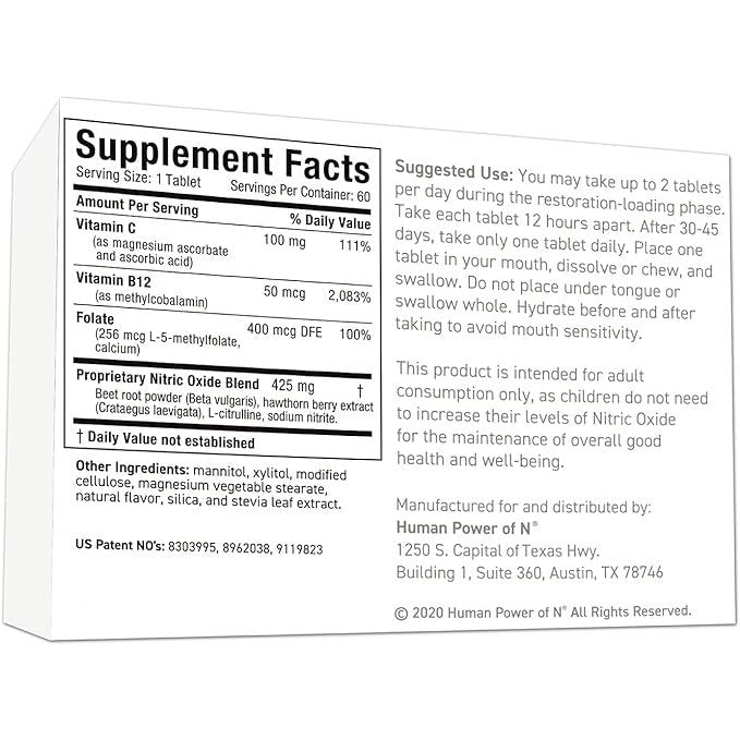 Clinical strength nitric oxide restoration formula, with added methylfolate for increased efficacy. Patented, quick-dissolve tabs clinically proven to generate nitric oxide in the mouth. The biphasic mechanism of action provides an immediate, rescue source of NO as well as a reserve pool of nitrate and nitrite, which the body can convert to NO in the endothelium as needed.