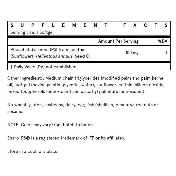 Jarrow Formulas Cogni-PS PS 100 softgels utilize a concentrated form of phosphatidylserine from non-GMO sunflower lecithin (soy-free) that offers excellent stability.