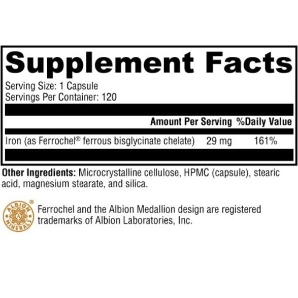 Iron bis-glycinate is a well-studied, 100% fully-reacted, patented form of iron exclusively from Albion Laboratories®. The amino acid glycine is actually one of the two starting materials the body uses to synthesize hemoglobin. Therefore, Superior Iron contributes two key factors. This form of iron has higher bioavailability, lower toxicity, less food reactivity, less food interactions and has a longer shelf life than any other common form of iron.