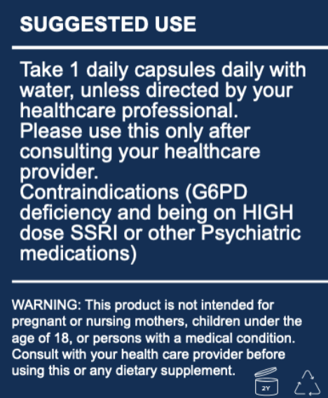 Contraindications (G6PD deficiency and being on HIGH dose SSRI or other Psychiatric medications)
