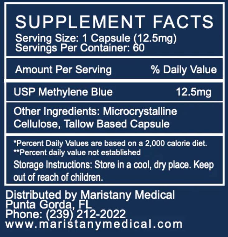Introducing USP Methylene Blue Capsules 12.5mg by Dr. Eduardo Maristany—a premium supplement designed to enhance cognitive function, boost cellular energy, and support overall brain health.